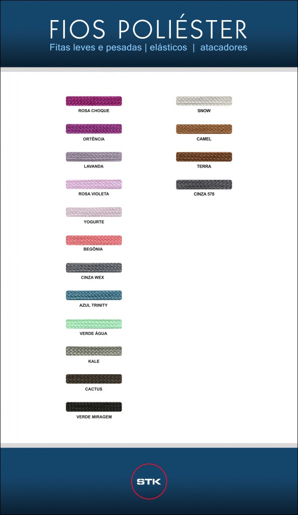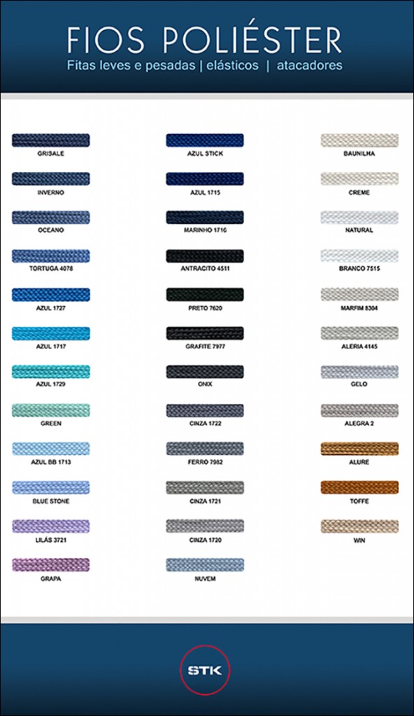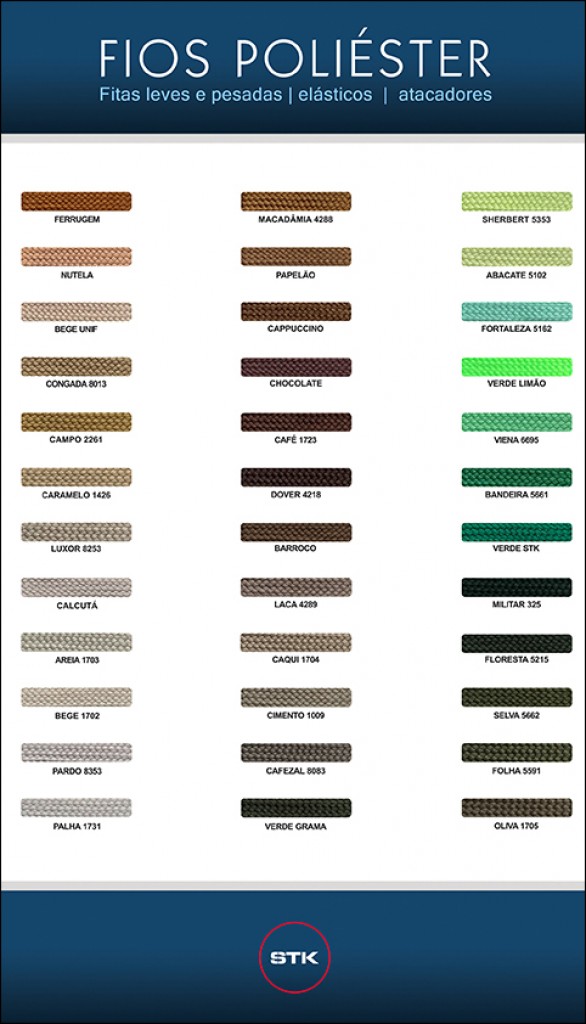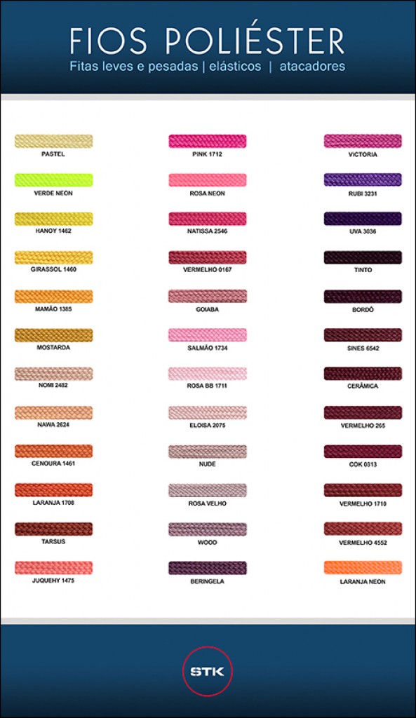 O Grupo Stickfran disponibiliza abaixo sua cartela de cores para confecção de fitas e elásticos. Para maiores detalhes entre em contato com o representante de sua região ou através do serviço de atendimento ao consumidor no "Menu Contato".